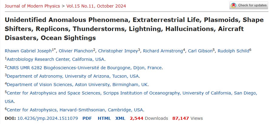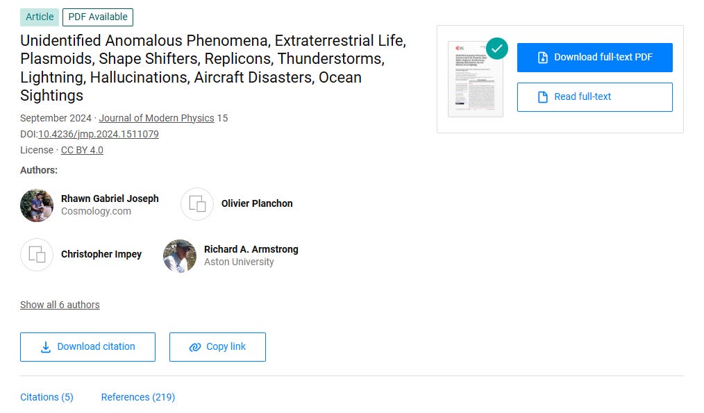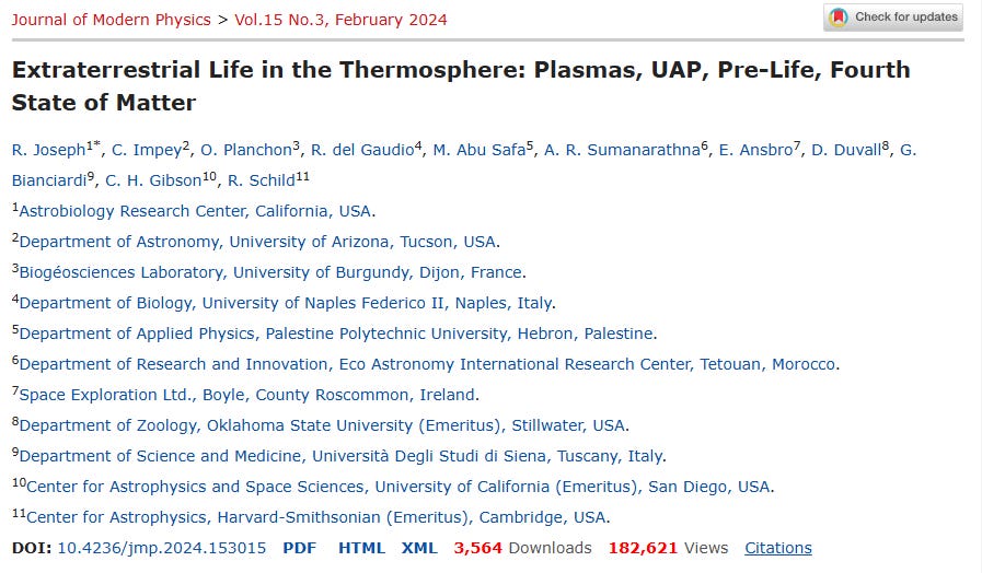 Although plasmas in the lower atmosphere may be responsible for UAP sightings over the centuries, including those that appear to “battle” over cities or follow and harass military ships and planes, plasmoids cannot account for all UAP which may include extraterrestrial spacecraft from other worlds._**