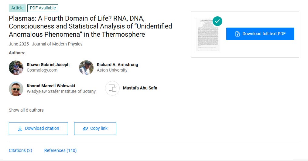 Plasmas: A Fourth Domain of Life? RNA, DNA, Consciousness and Statistical Analysis of “Unidentified Anomalous Phenomena” in the Thermosphere